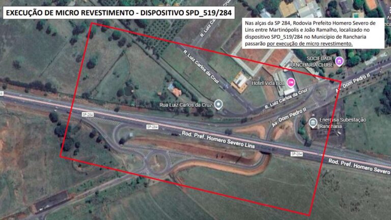 Rancharia, 26 de novembro de 2025 – A Eixo SP Concessionária de Rodovias realiza desta quinta até sábado, dias 27 a 29, serviços de melhorias no pavimento das alças de acesso localizadas no dispositivo do km 519 da SP 284 – Rodovia Prefeito Homero Severo Lins, em Rancharia. O dispositivo fica próximo à subestação da Energisa e as alças fazem a ligação da rodovia com a avenida Dom Pedro 2º que passa pela região central do município. Para a execução segura dos trabalhos, será necessária a interdição total das alças em ambos os sentidos no período das 7h às 17h nos três dias.