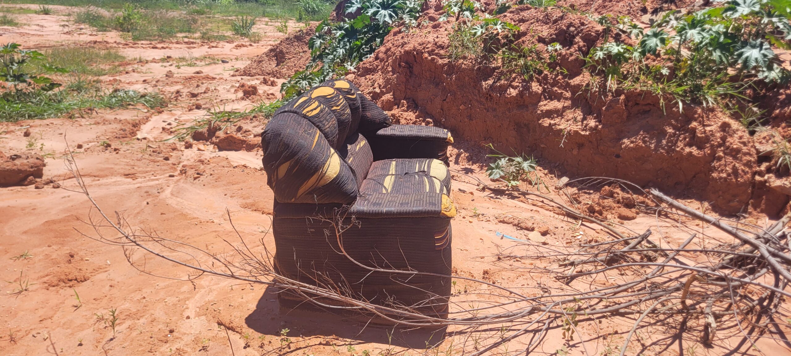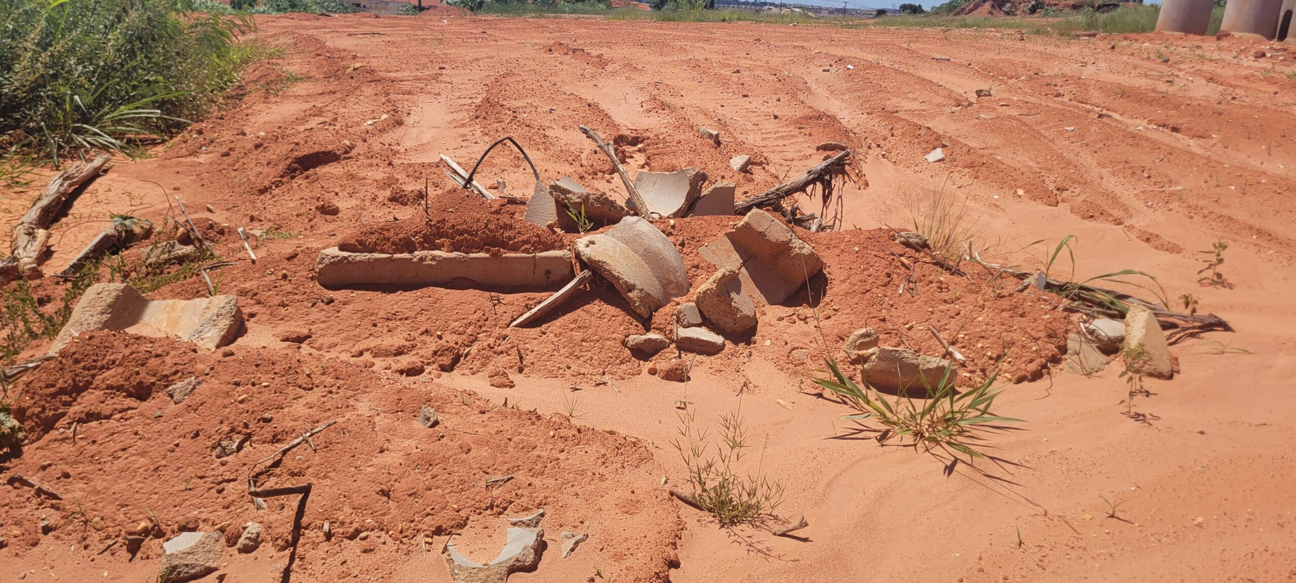Além disso, o terreno está tomado por lixo, restos de construção, sofás velhos e tubos de drenagem de galerias pluviais, provenientes de uma obra de abertura de rua recente e não terminada, que gera outro problema grave.