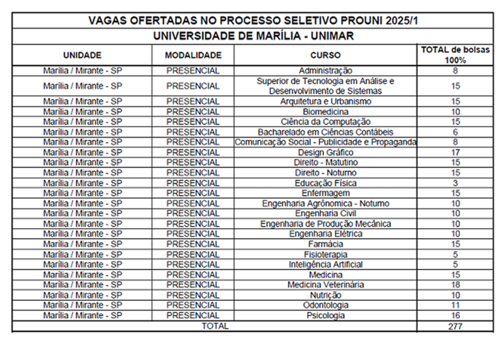 No campus de Marília, a Unimar oferece 277 bolsas integrais para cursos presenciais em diversas áreas, como Administração, Direito, Medicina, Psicologia e Engenharia. Entre os destaques estão os cursos de Medicina, com 15 bolsas, Medicina Veterinária, com 18 vagas, e Direito, com 30 bolsas divididas entre os períodos matutino e noturno.